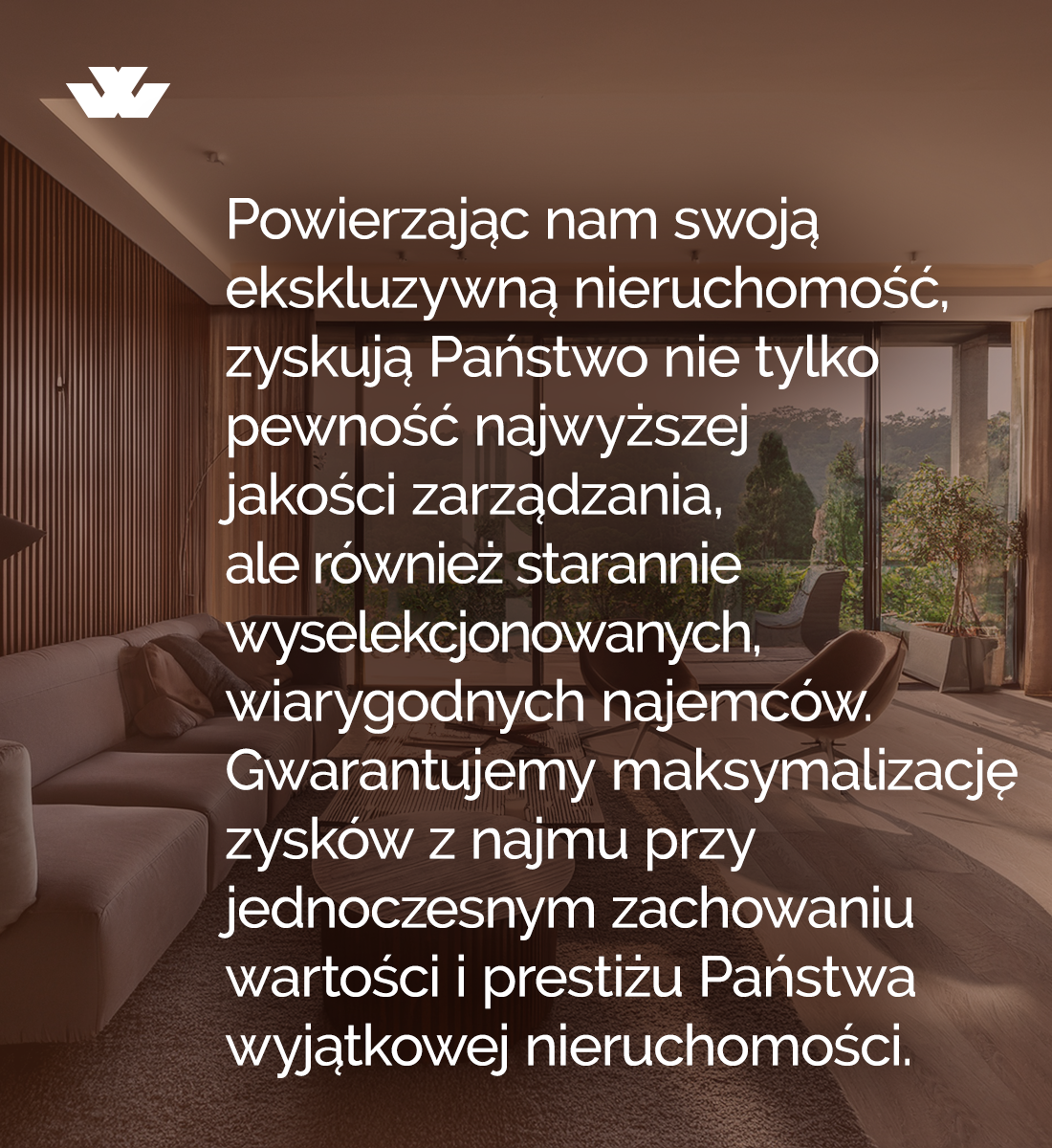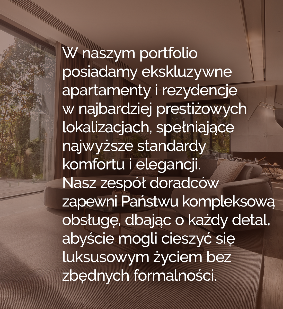 Walter Herz Residential oferuje kompleksowe wsparcie w zakresie obrotu różnorodnymi nieruchomościami premium. Specjalizujemy się w sprzedaży, wynajmie i zakupie ekskluzywnych apartamentów oraz rezydencji, a także lokali inwestycyjnych i prestiżowych działek pod budowę. Dzięki szerokiemu portfolio i najwyższym standardom obsługi zapewniamy klientom dopasowane rozwiązania na każdym etapie inwestycji.